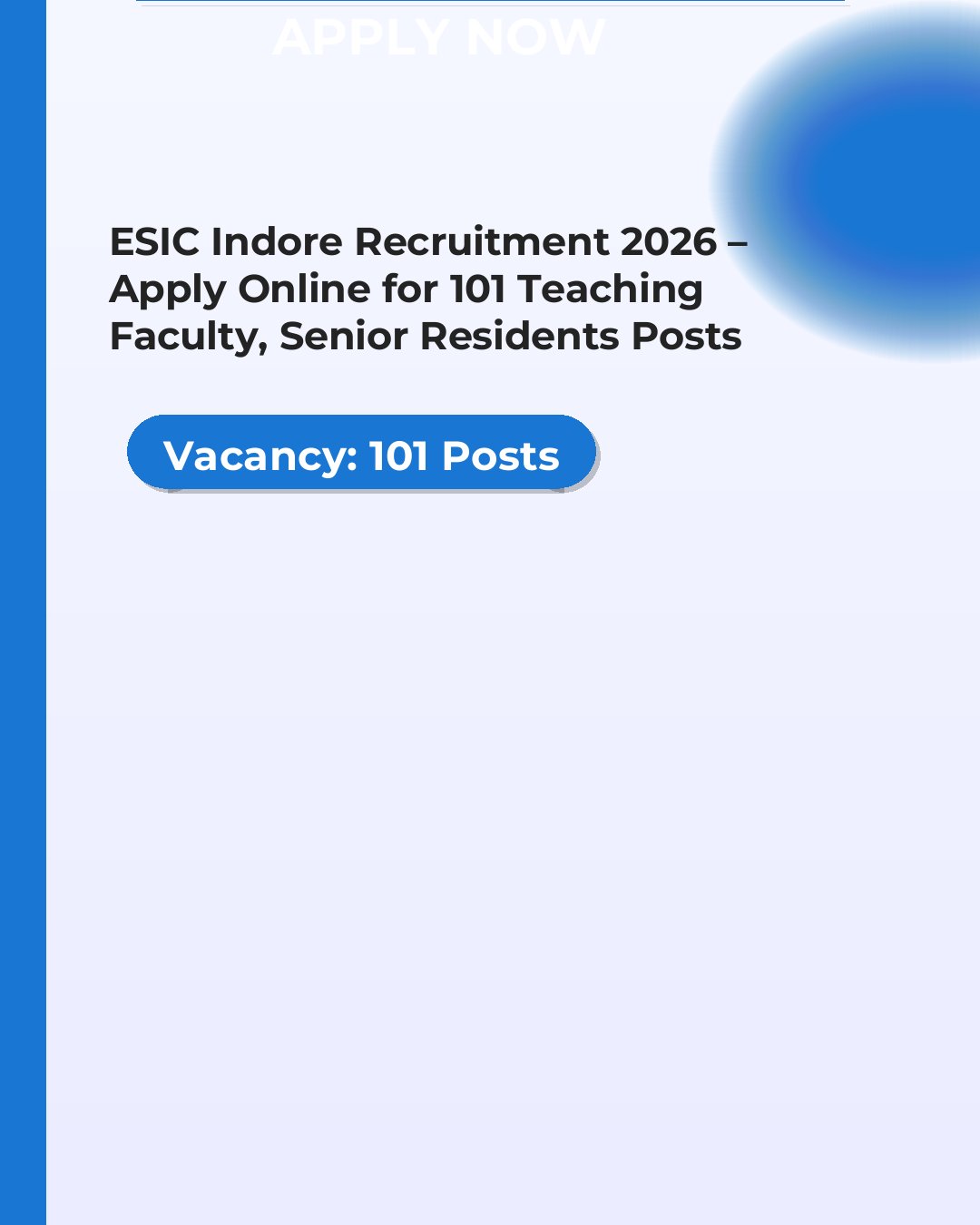 Employees State Insurance Corporation (ESIC Indore) Recruitment 2026 for 101 posts of Teaching Faculty,Senior Residents. Candidates with MBBS, MD, MS, DNB, PG-Diploma Can Apply Online. The last date to apply online is 02-03-2026. The candidate shall apply online through ESIC Indore official website.