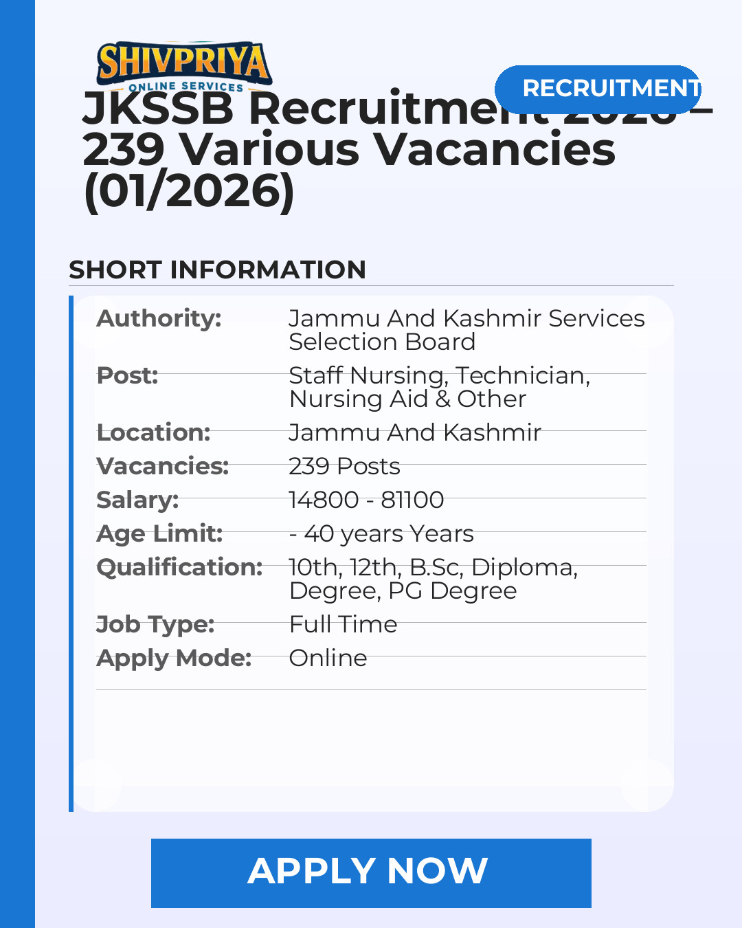 JKSSB Various Post Online Form 2026: The Jammu And Kashmir Services Selection Board has published the recruitment notification (Advt No. 01 of 2026) on its official website. https://www.jkssb.nic.in The notification is for the recruitment of 239 Staff Nursing, Technician, Nursing Aid & Other posts. The last date to apply for these vacancies is 25/03/2026. Candidates who have 10th, 12th, B.Sc, Diploma, Degree, PG Degree qualifications can apply Apply Online for JKSSB Recruitment 2026. Interested candidates must read the official notification carefully and complete the application process as per the given instructions. The official website link and the JKSSB Recruitment 2026 notification link are provided below under the heading Important Links.