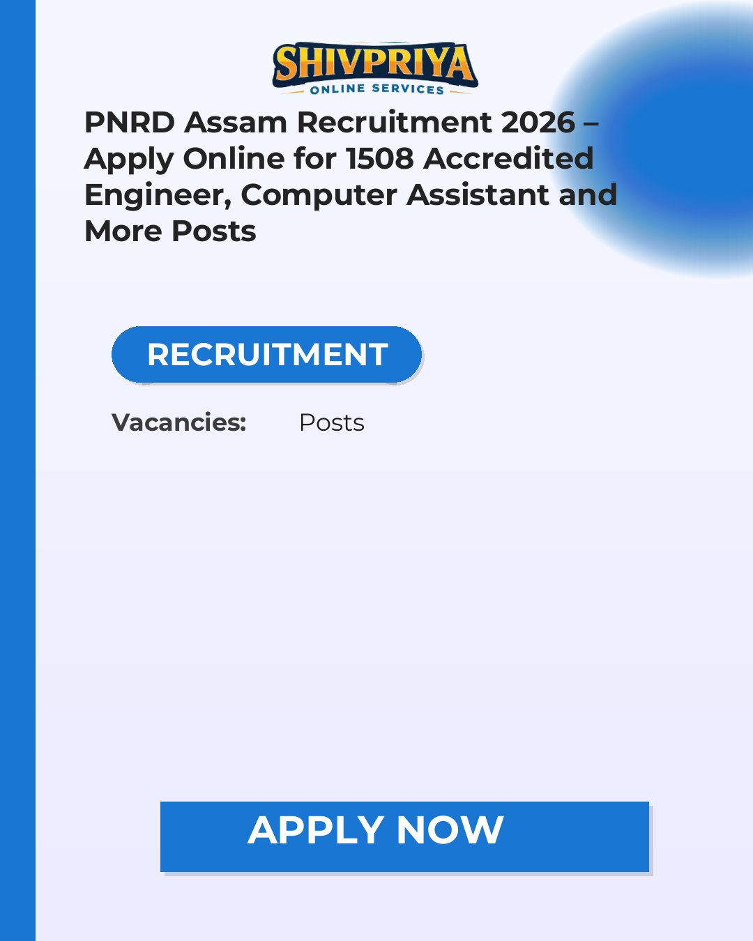 Panchayat and Rural Development Assam has released the PNRD Assam Recruitment 2026 notification for 1508 vacancies including Accredited Engineer, Computer Assistant and other posts, with online applications open from 22-02-2026 to 22-03-2026 at pnrd.assam.gov.in.