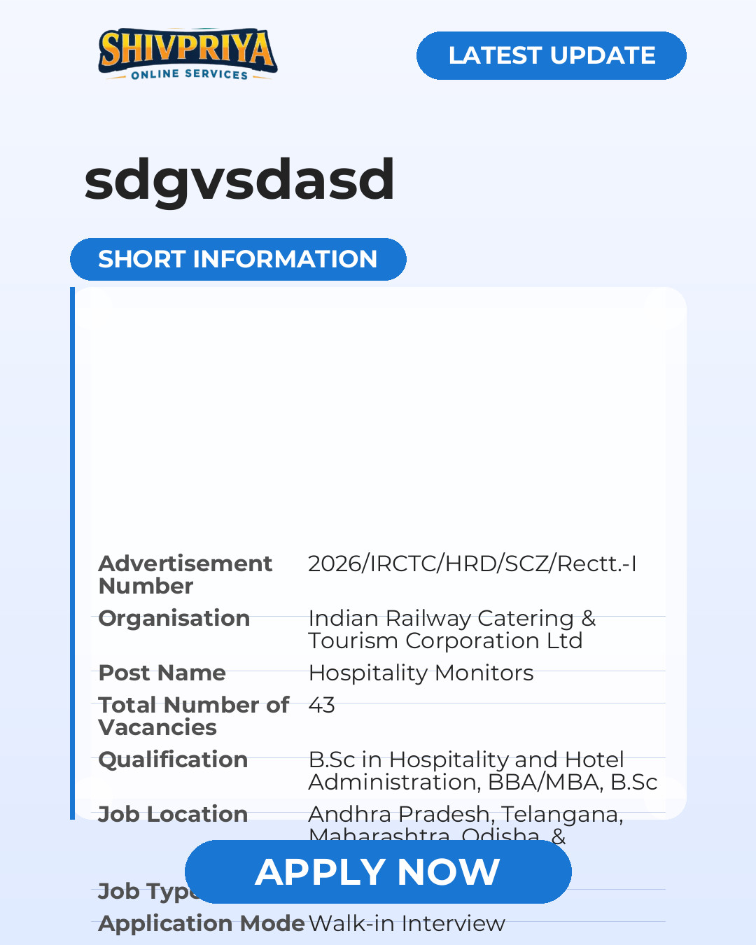 | Advertisement Number | 2026/IRCTC/HRD/SCZ/Rectt.-I |