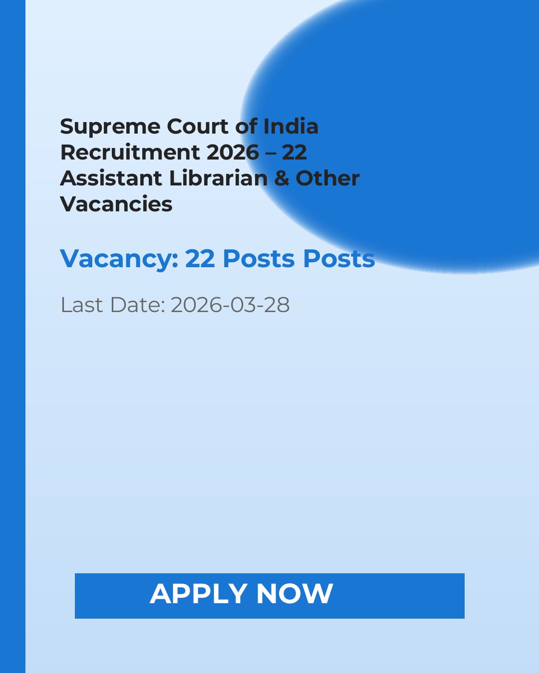 Supreme Court of India Assistant Librarian Online Form 2026: The Supreme Court of India has published the recruitment notification (Advt No. F.6/RC-2025) on its official website. https://www.sci.gov.in The notification is for the recruitment of 22 Assistant Librarian, Assistant Editor & Other posts. The last date to apply for these vacancies is 08/03/2026. Candidates who have Degree in Law, Master Degree, Degree qualifications can apply Apply Online for Supreme Court of India Recruitment 2026. Interested candidates must read the official notification carefully and complete the application process as per the given instructions. The official website link and the Supreme Court of India Recruitment 2026 notification link are provided below under the heading Important Links.