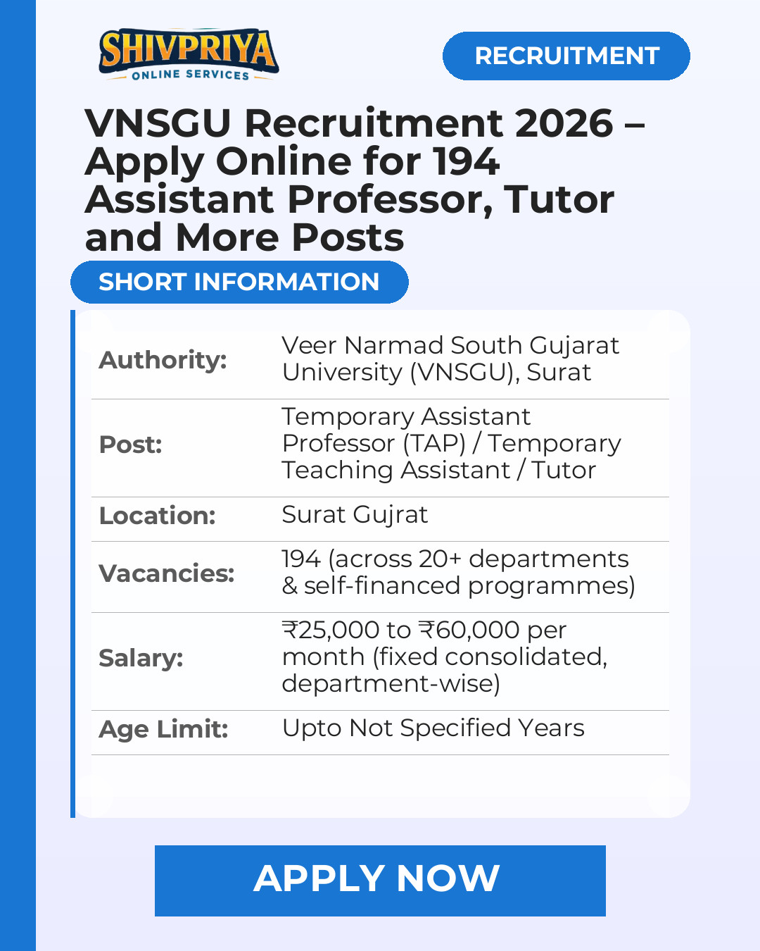 The Veer Narmad South Gujarat University (VNSGU) Recruitment 2026 for posts of 194 Assistant Professor, Tutor and More. Candidates with Any Masters Degree, M.Phil/Ph.D Can Apply Online. The online application opens closes on 26-03-2026. The candidate shall apply online through VNSGU website, vnsgu.ac.in/.